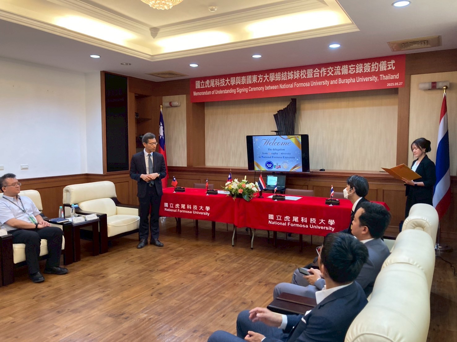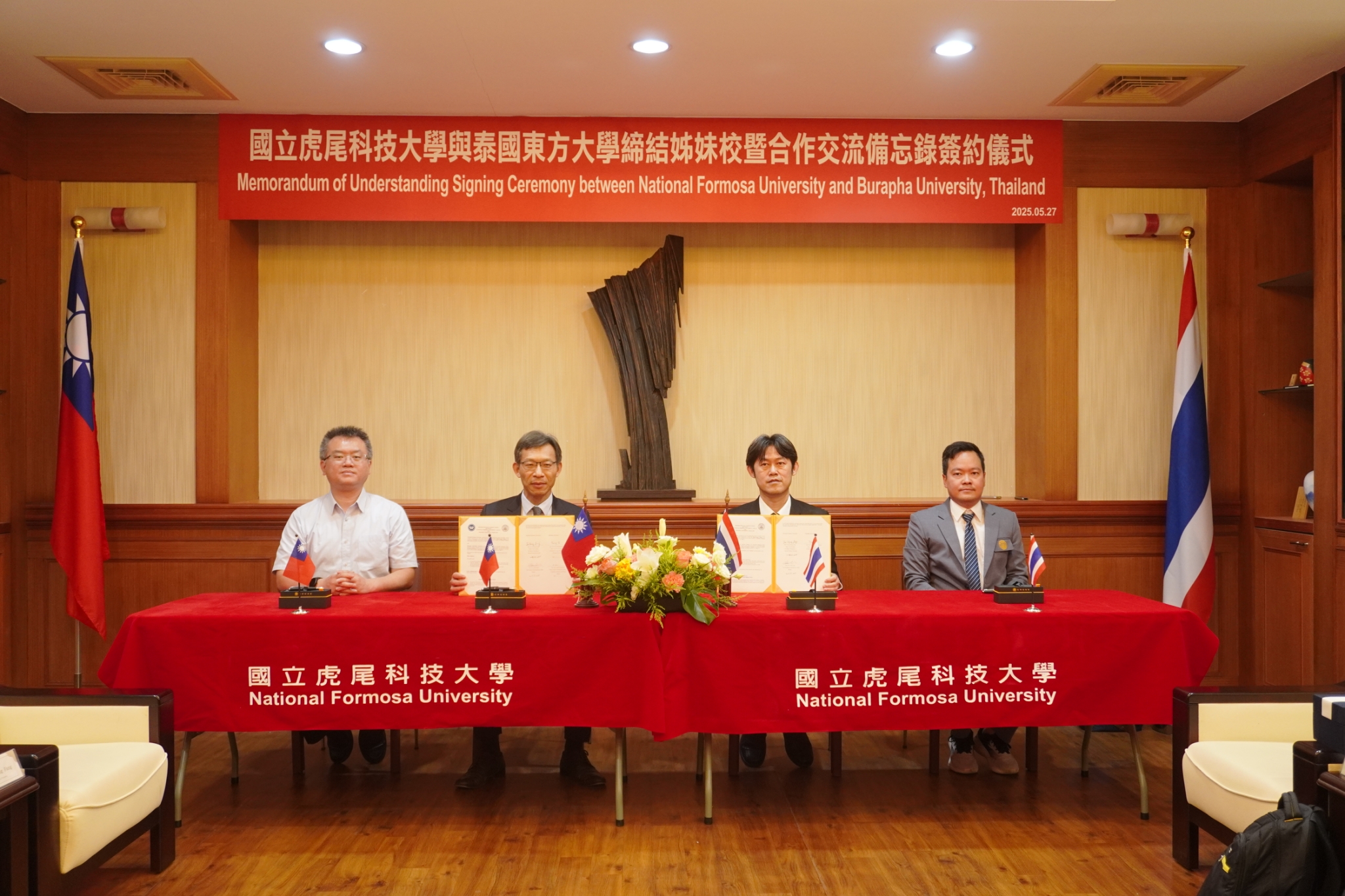 On May 27, 2025, National Formosa University (NFU) held a Memorandum of Understanding (MoU) signing ceremony with Burapha University (BUU), Thailand, marking the beginning of a promising partnership. The BUU delegation was led by Dr. Pairoj Raothanachonkun, Dean of the Faculty of Logistics, and Dr. Anirut Kantasa-ard, Associate Dean for International Affairs at the Faculty of Logistics.
